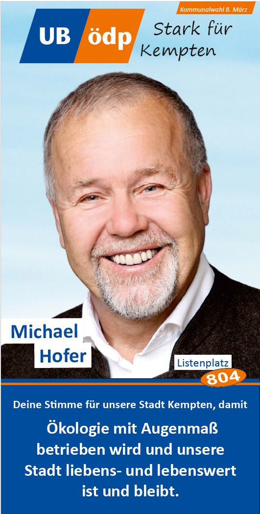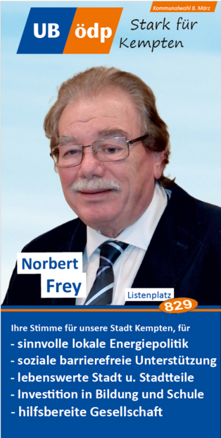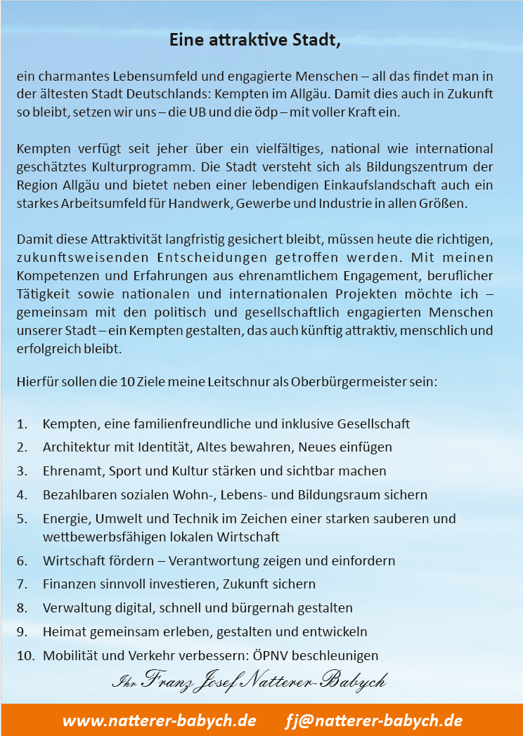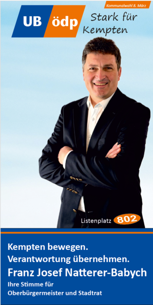 Zum OB Kandidaten wurde einstimmig Stadtrat Franz Josef Natterer-Babych gewählt, der bei seiner Vorstellungs- und Bewerbungsrede den Fokus auf die technische Erneuerung der Kemptener Energieinfrastruktur legte, dass also jede PV-Anlage und jede eingesparte KWh uns vom Abfluss finanzieller Ressourcen ins Ausland unabhängiger macht. Das eingesparte Geld könne dann für die Vereine vor Ort verwendet und so letztlich der bürgerschaftliche Zusammenhalt gestärkt werden. Dass damit auch die Wirtschaft und Gesellschaft davon profitiert, dass Energie günstiger wird, sieht er als Grundlage für eine starkes und wettbewerbsfähiger Allgäu, von dem alle profitieren: Unternehmer, Selbstständige, Familien und jeder Einwohner unserer schönen gepflegten Region.