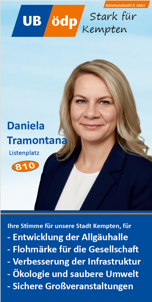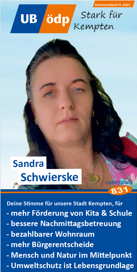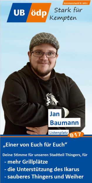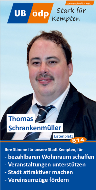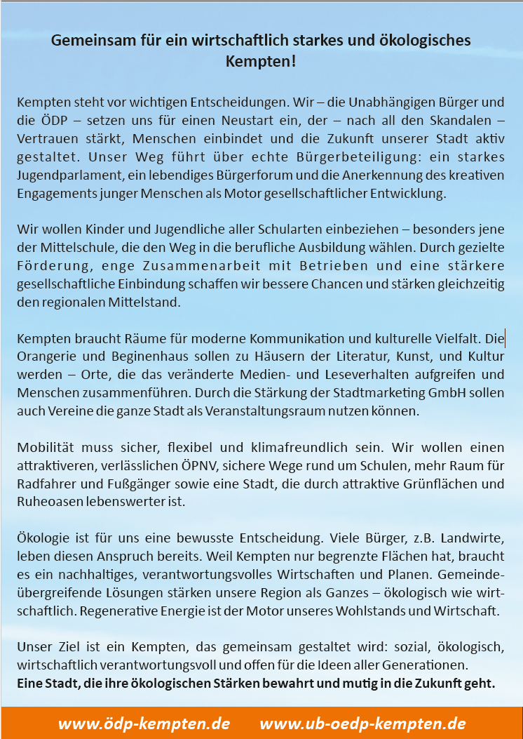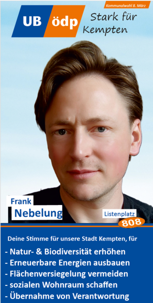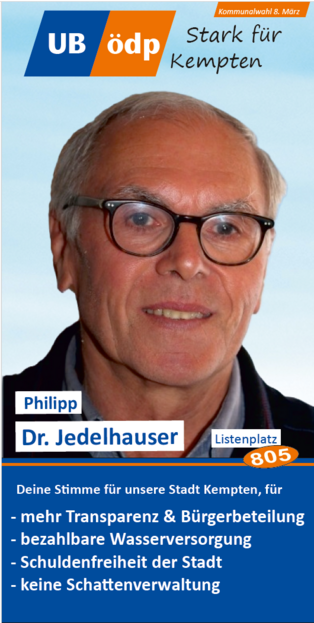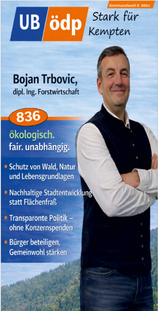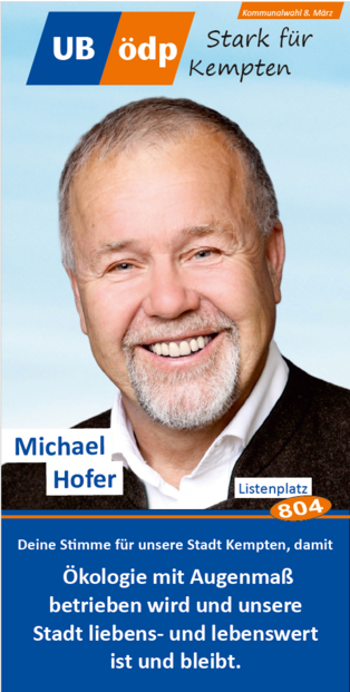 Er dankte den Vertretern der verschiedenen Communities (Deutsch-Türken, Deutsch-Ukrainern) und den vielen Ehrenamtlichen, wie den drei Vorständen des VdK Sankt Mang, dem Foodsaver, dem Vertreter des Urban Gardening, der Flüchtlings- und der Obdachlosenbetreuerin für ihren Dienst an der Gemeinschaft. Mit ihrer Kandidatur für die UB/ÖDP Liste würden sie alle eine Alternative für ein gelungenes und respektvolles Miteinander stärken und auch der Filzokratie Einhalt gebieten, denn die ÖDP habe sich seit ihrer Gründung verpflichtet, keine Konzernspenden anzunehmen.