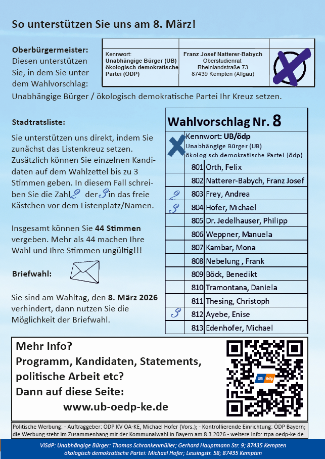 Hier das Ergebnis der Nominierungsversammlung der Gruppierung Unabhängige Bürger/ Ökologisch Demokratische Partei (UB/ÖDP) vom 23. 11. 2025 zur Stadtratswahl 2026.